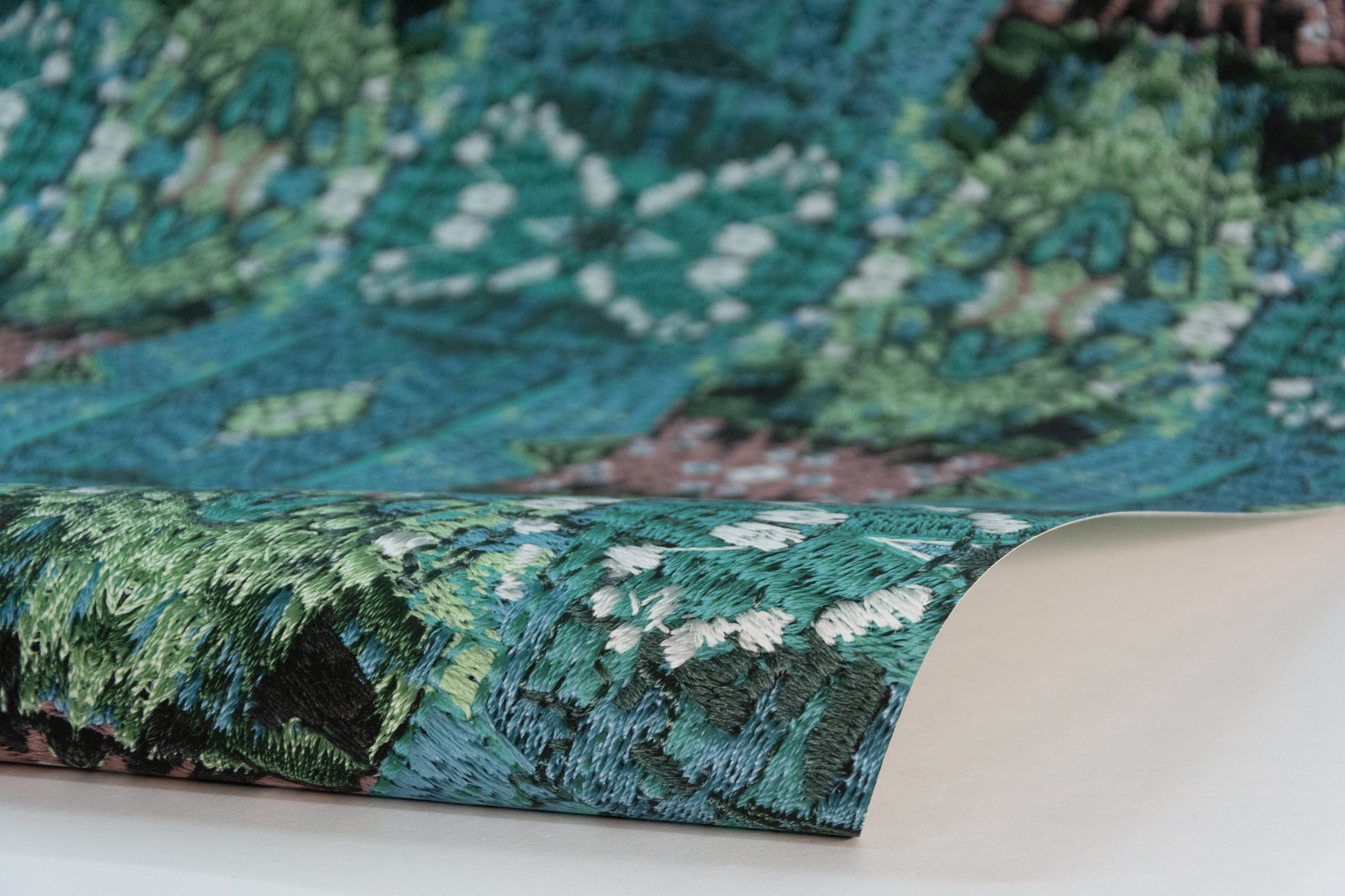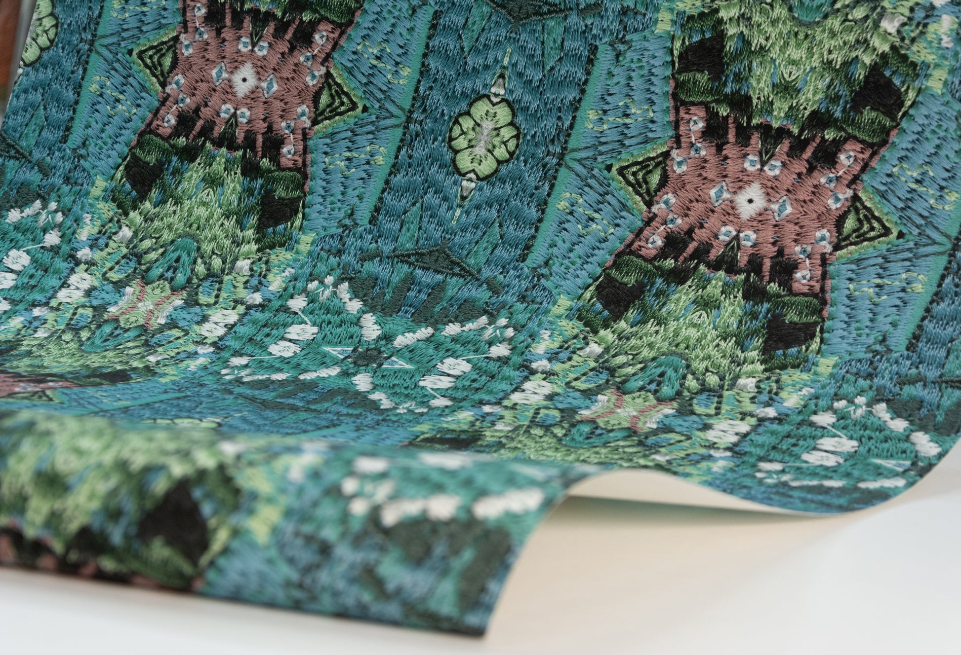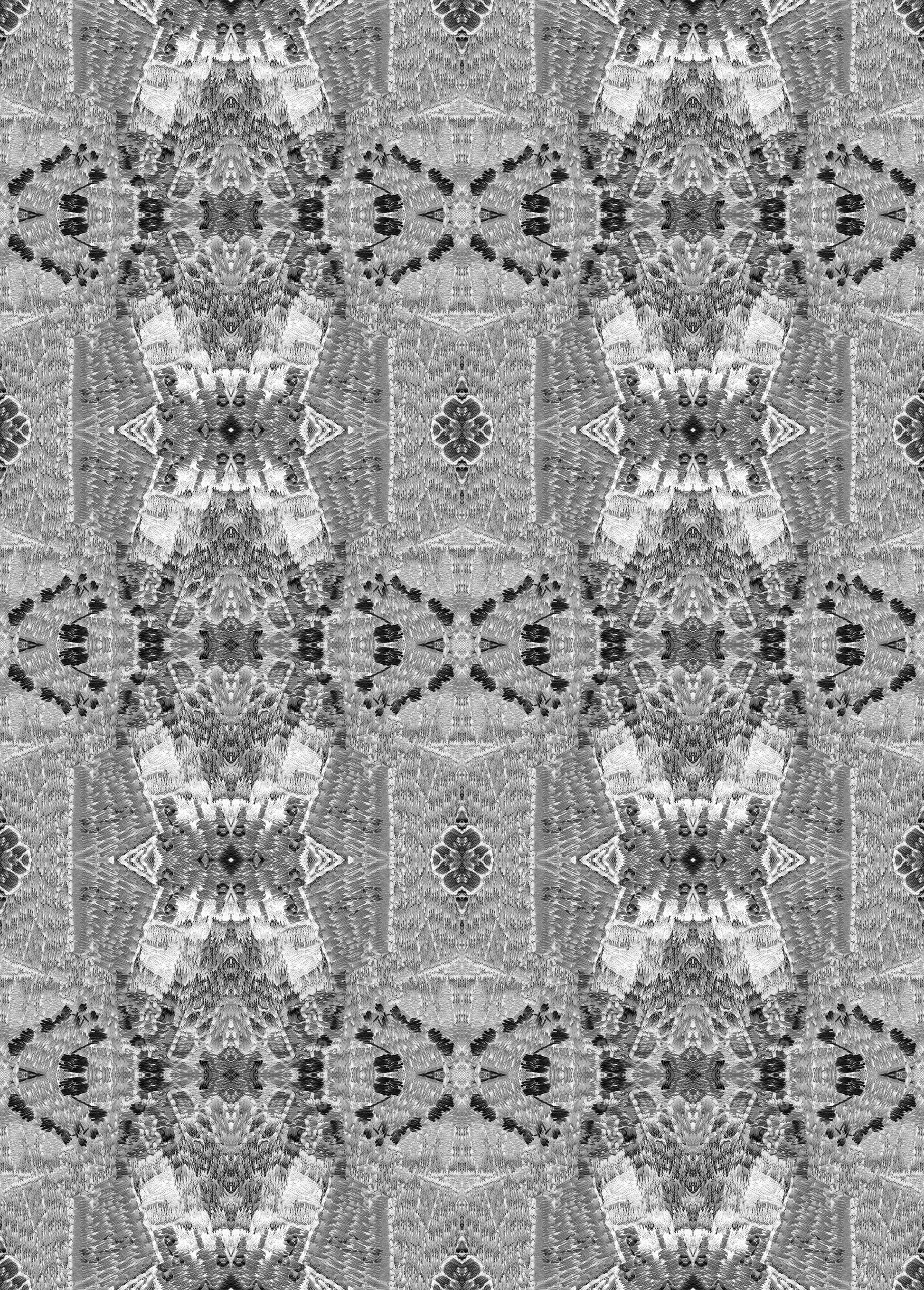 Warum nicht – Samstag Nacht mit dem Kaleidoskop ganz tief in eine samtig-weiche Stickerei eintauchen. Saturday Night Special lädt zum Verweilen, zum Sich-Vertiefen ein, sei es in die bloße Form (Schwarz-Weiß) oder in sanfte lila Augen vor tiefgründigem Grün. Dieser Rapport zieht auch hitzige Gemüter in seinen Bann.