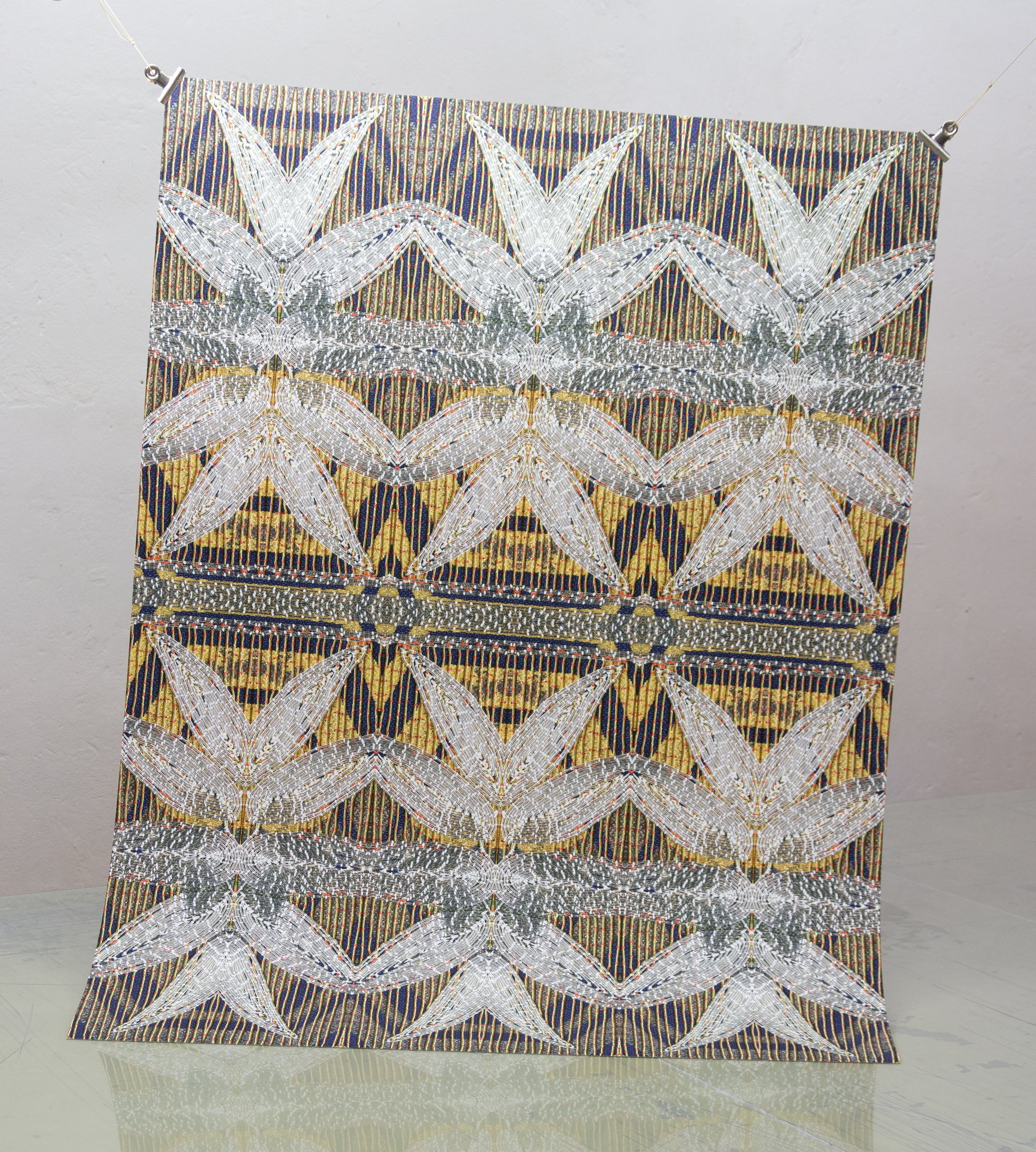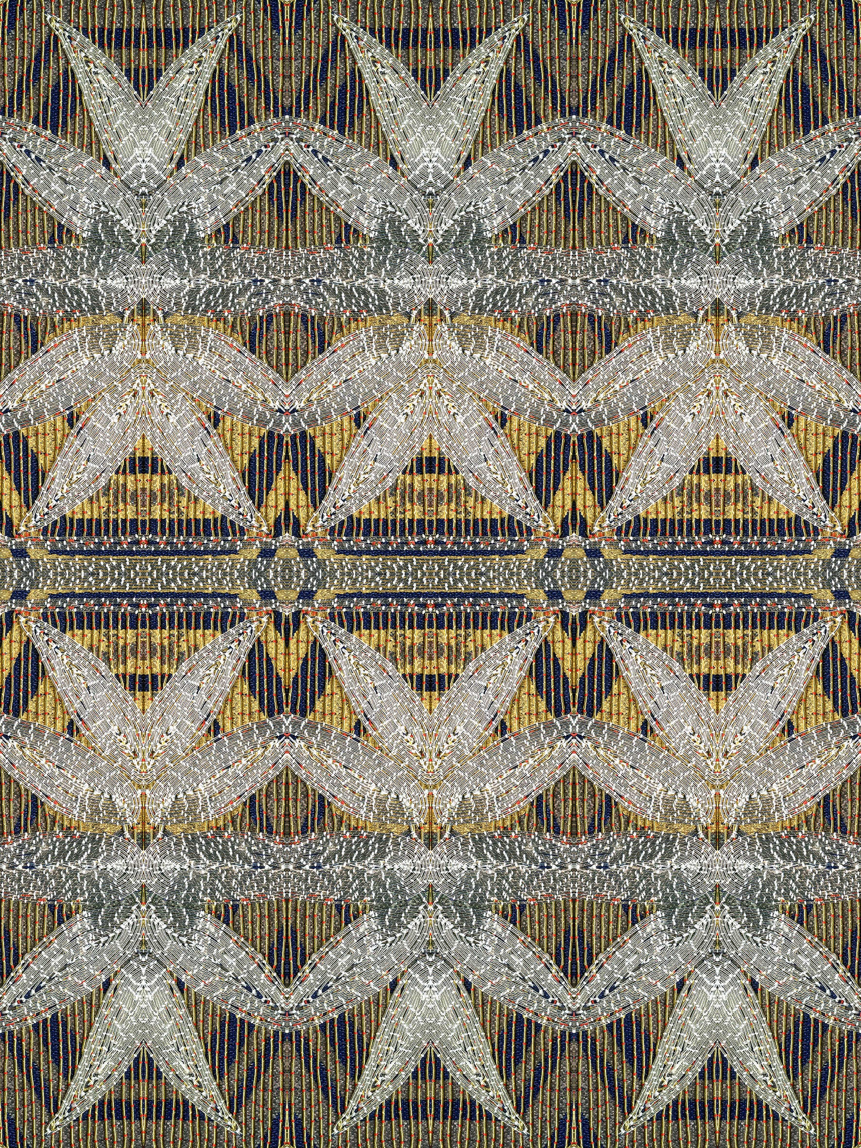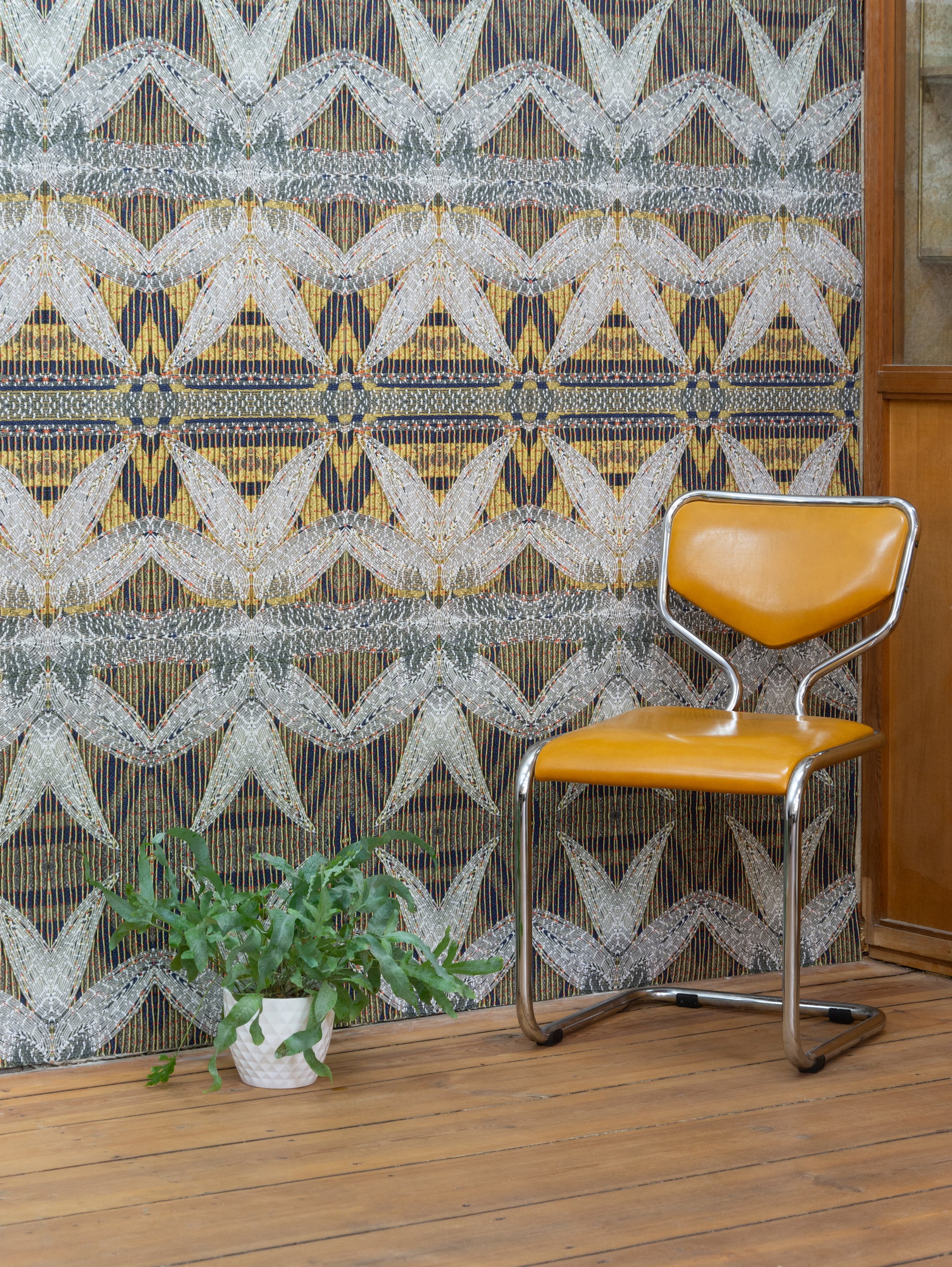 Joy showers dazzling sparks: alien beaded creatures join hands in front of a golden curtain and thunder their song together into the room. This wallpaper isn’t for melancholic souls.