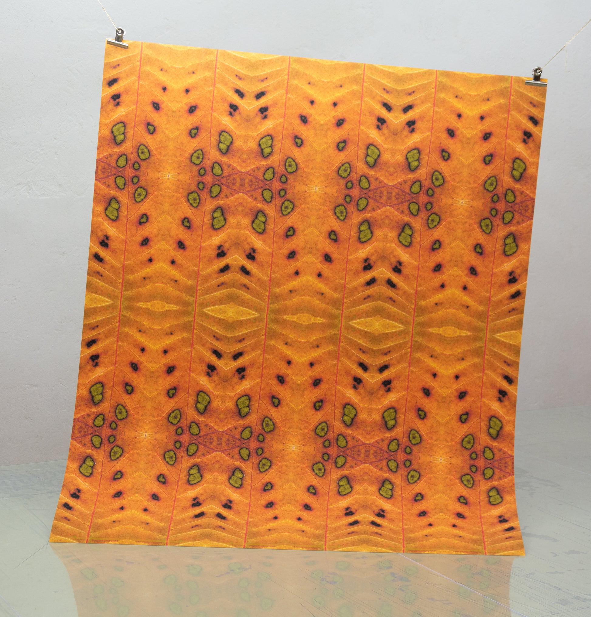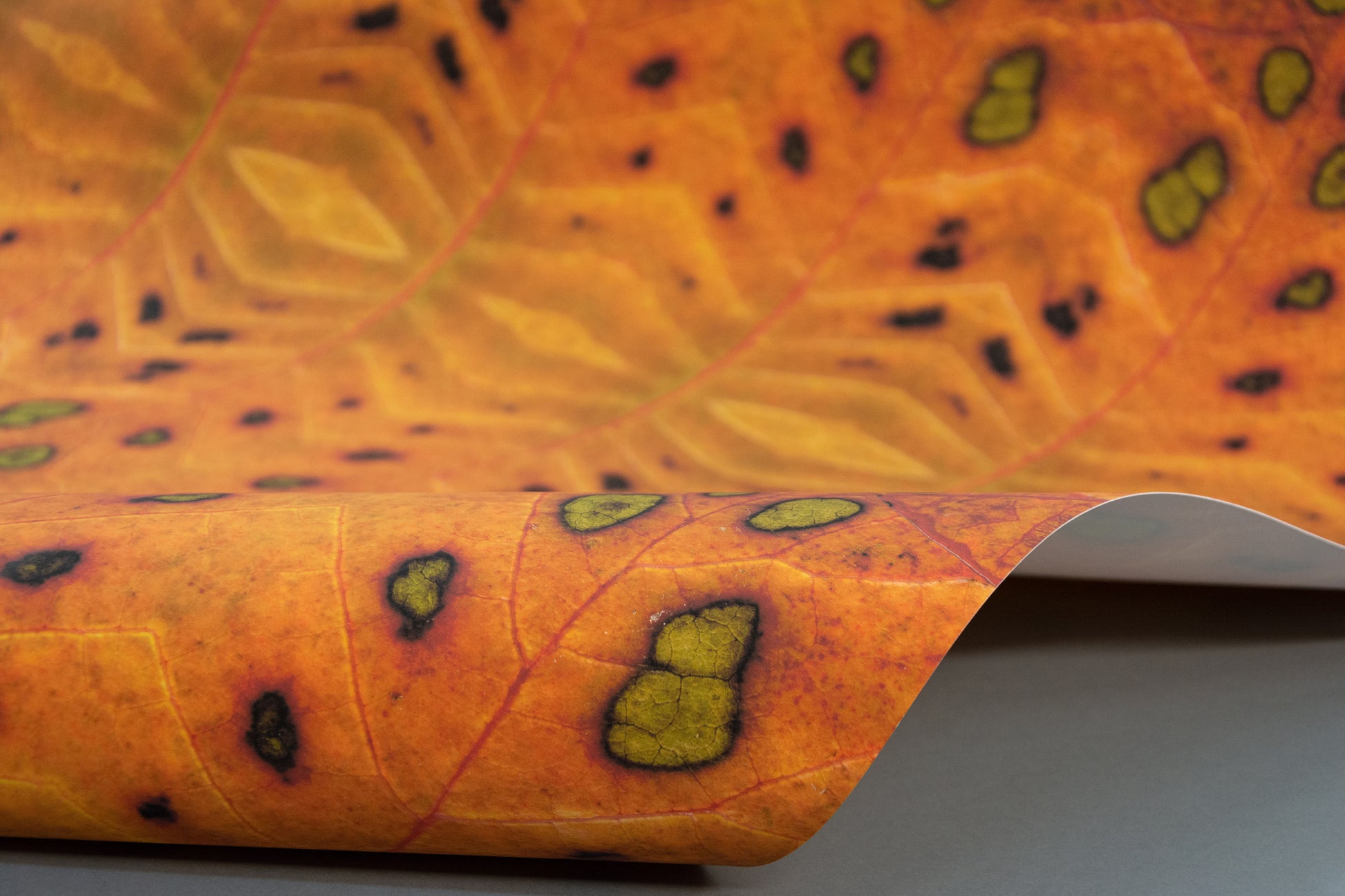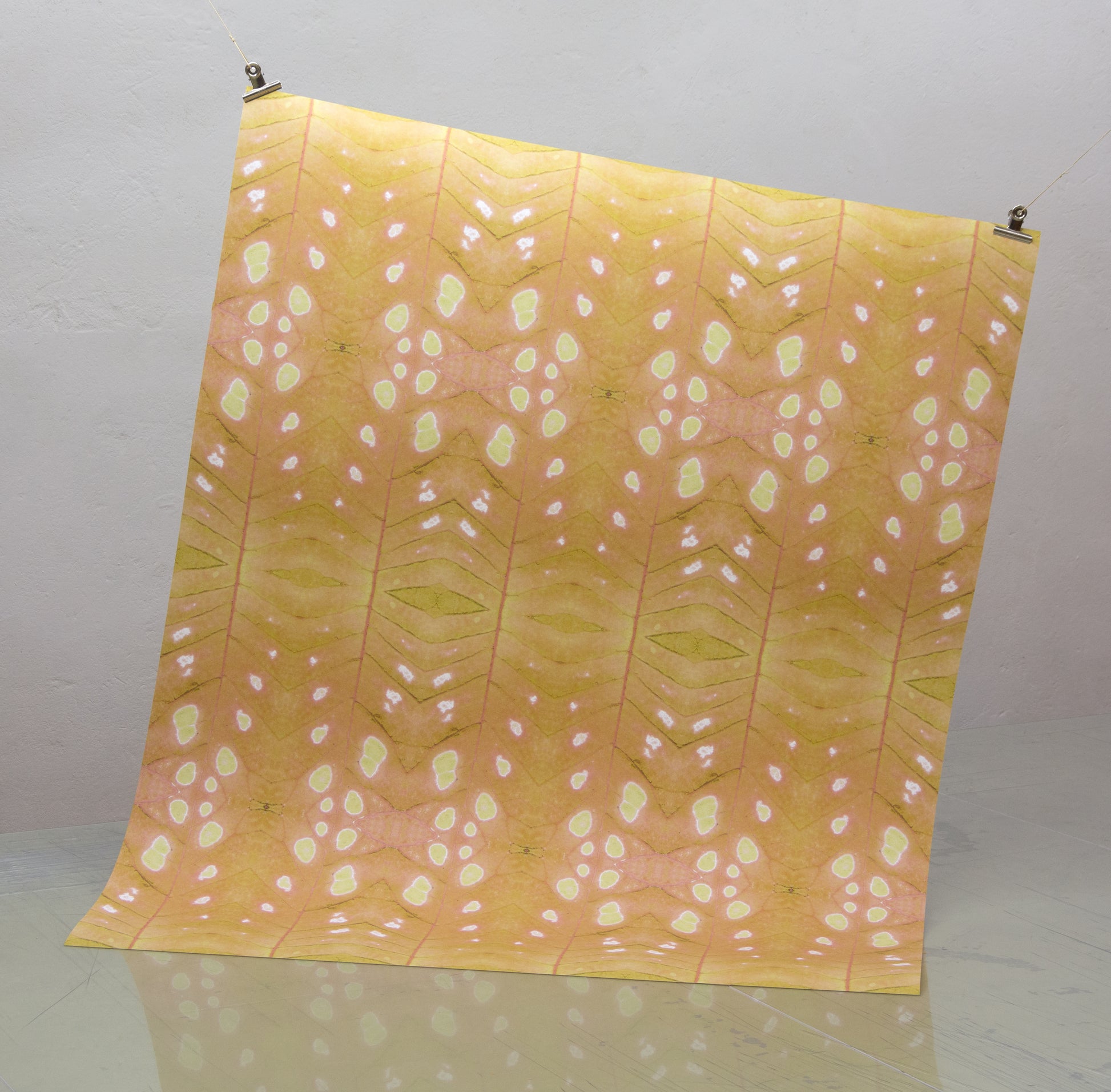 Endless foliage whose “blind spots” hold the promise of external youth. Blind spots, in vibrant shades of red or a more delicate green-yellow. Like burn marks, they perforate everyday monotony, and the room crackles with expectation.