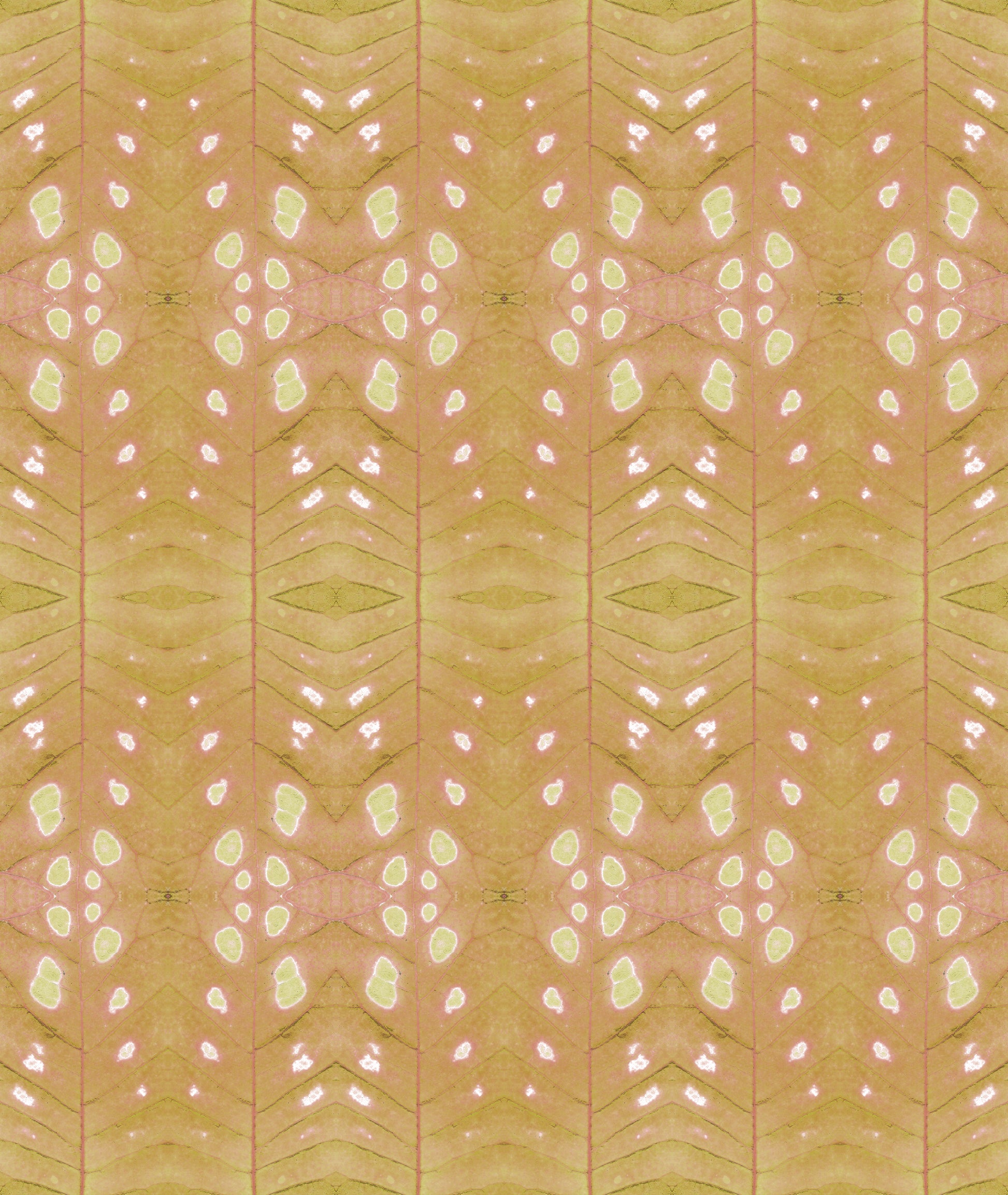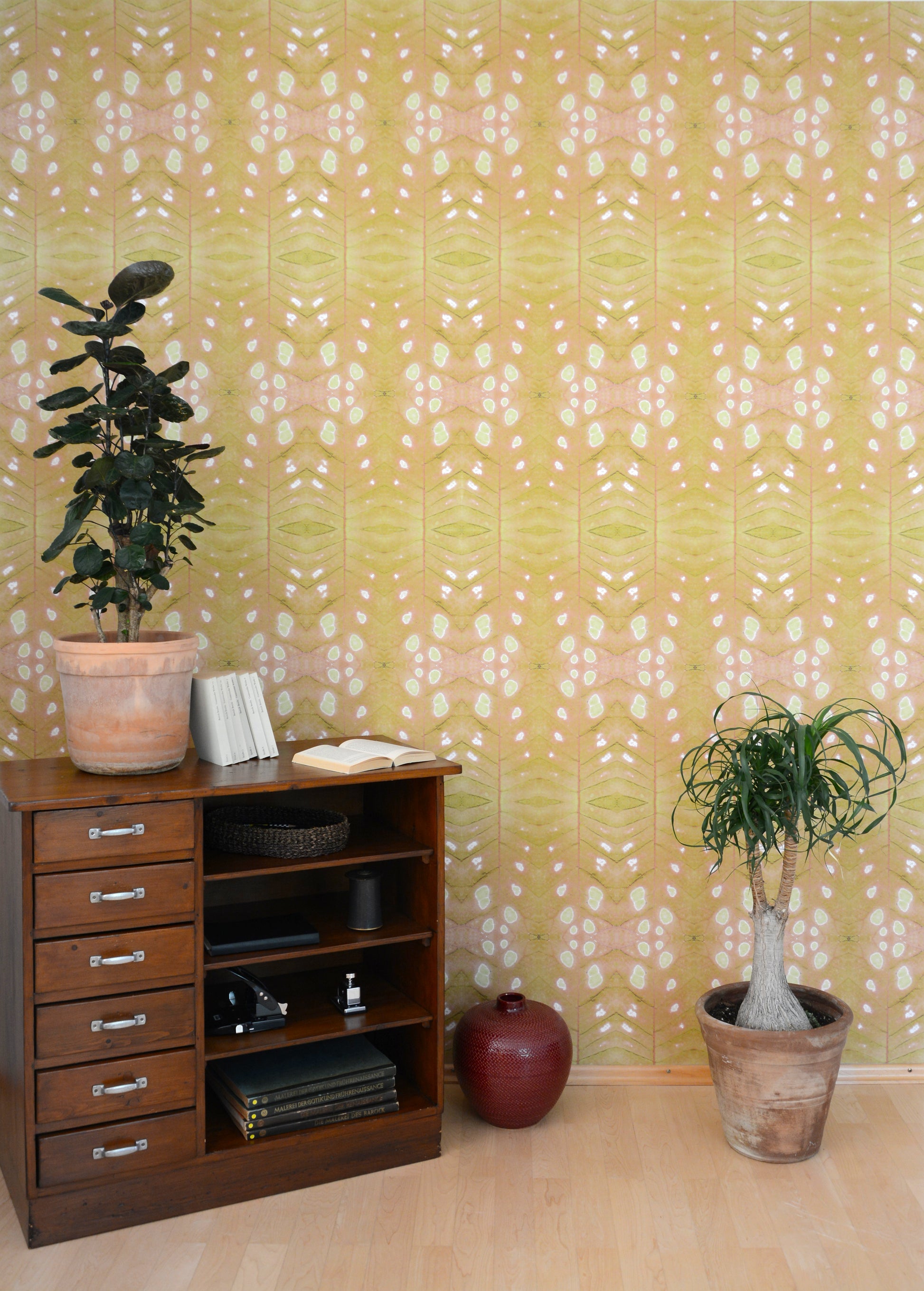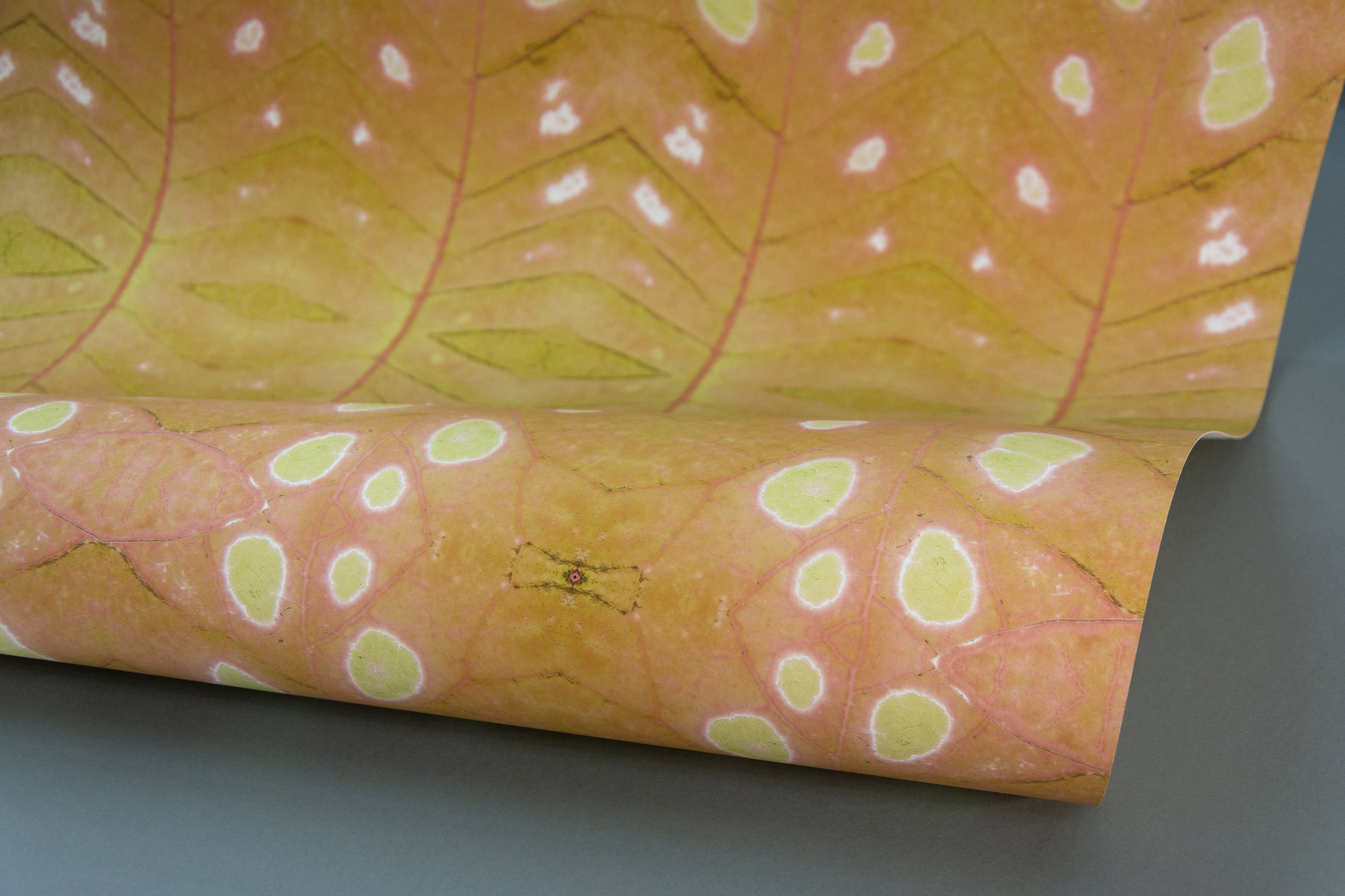 Endless foliage whose “blind spots” hold the promise of external youth. Blind spots, in vibrant shades of red or a more delicate green-yellow. Like burn marks, they perforate everyday monotony, and the room crackles with expectation.